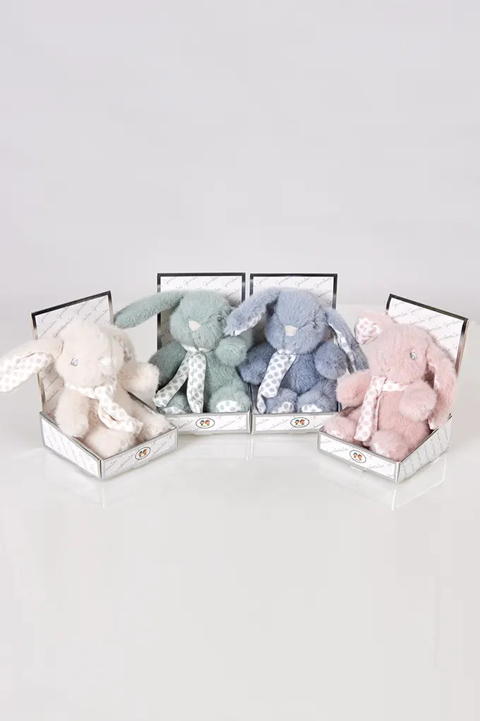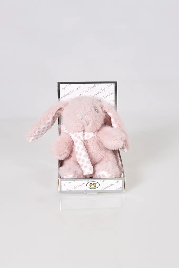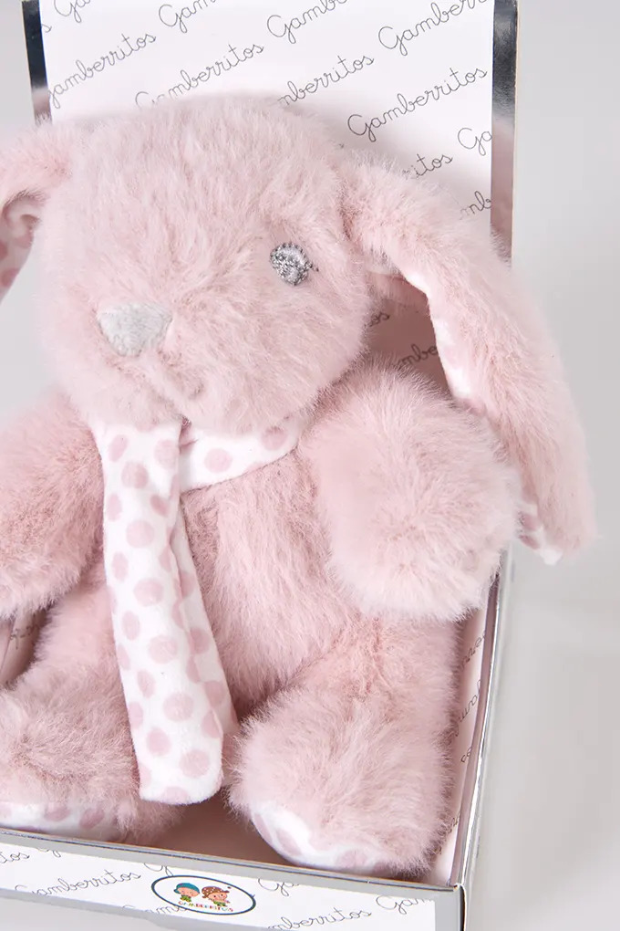 Boneco pequeno em forma de coelho em tecido de coralina com estampado de bolinhas.