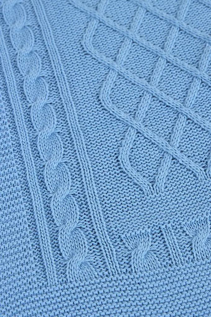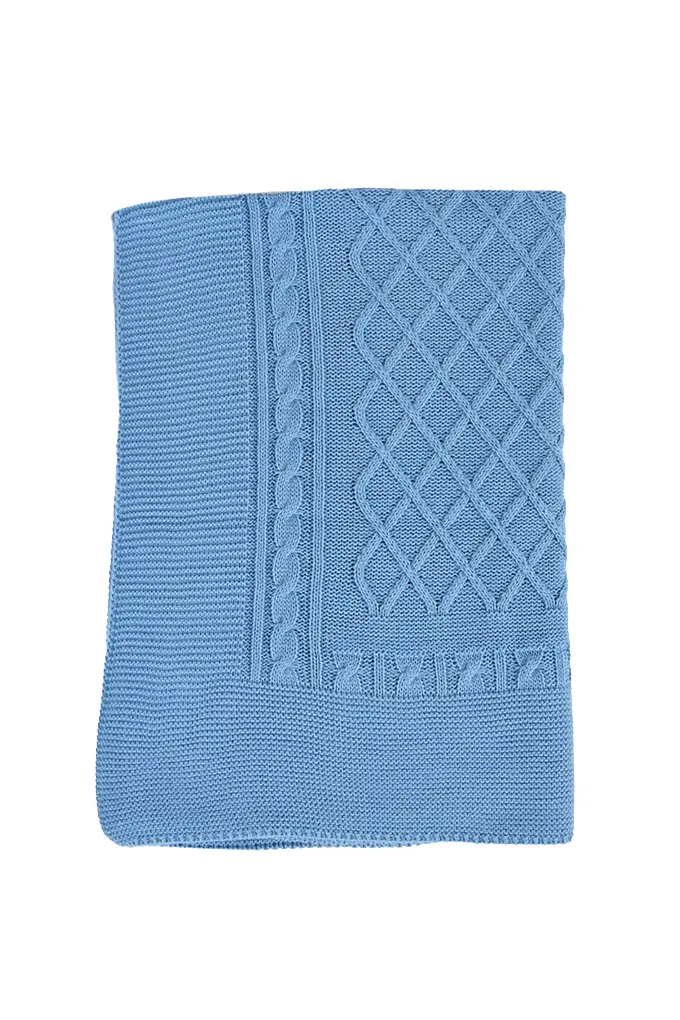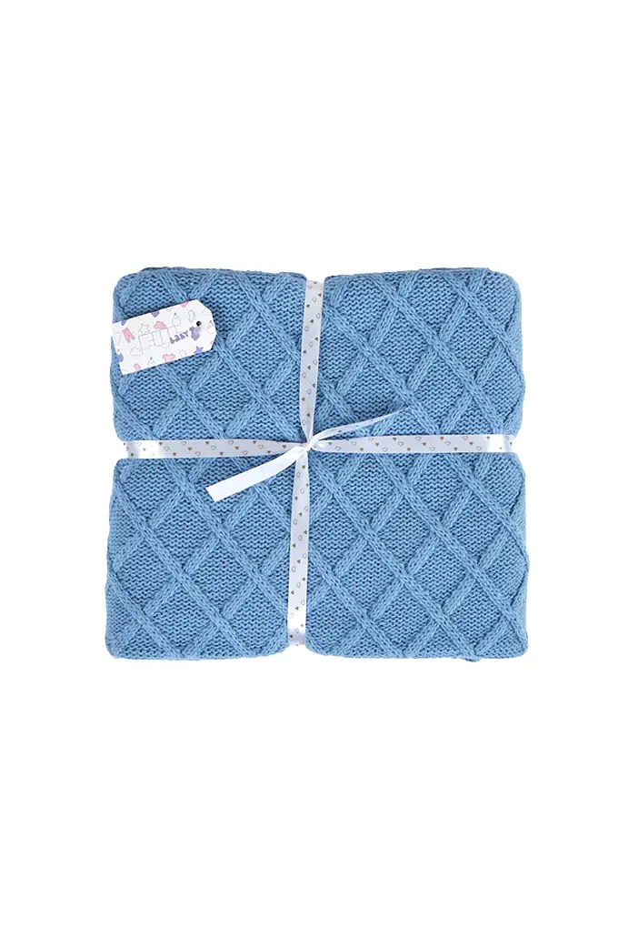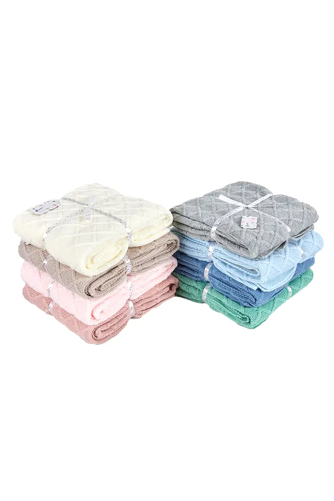 Manta fabricada em tecido de malha com padrão geométrico.