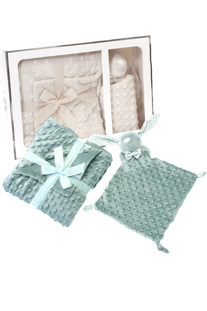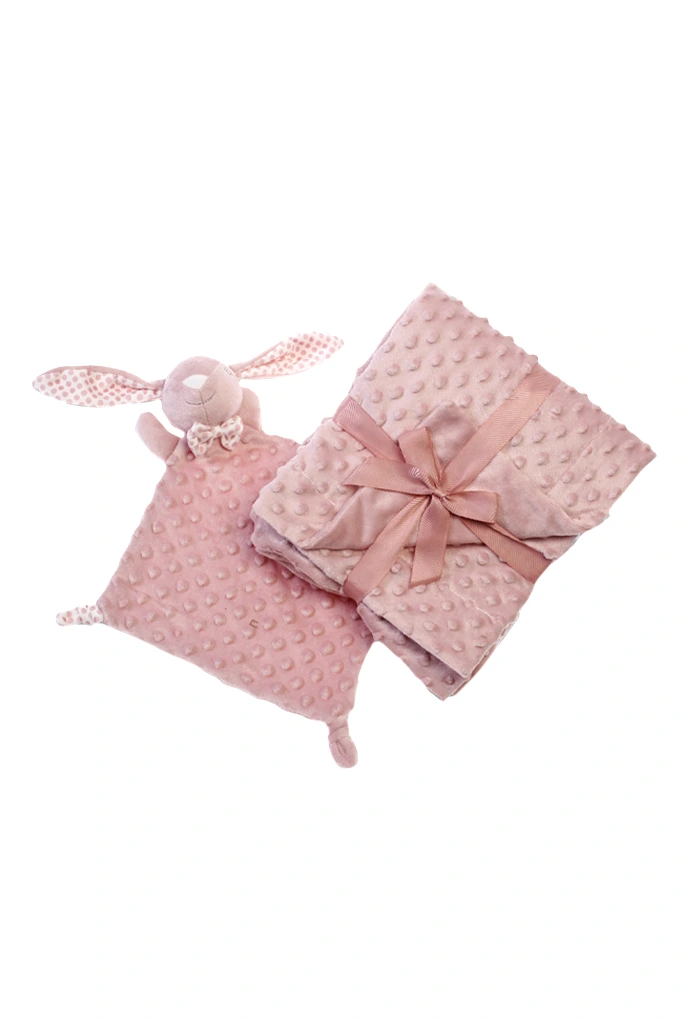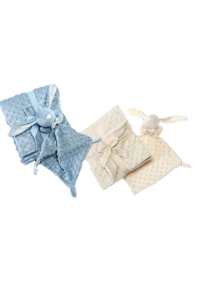Manta e doudou em tecido de topitos com forma de coelho.azul