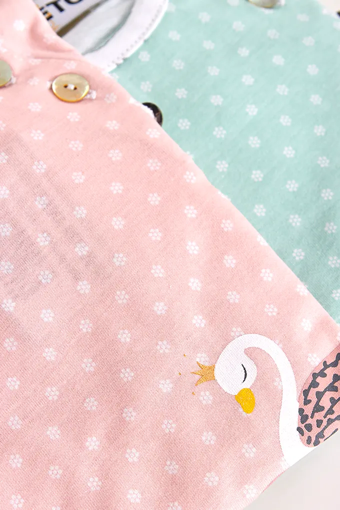 Pijama estampado sem carda, com camisola de mangas compridas e gola redonda com estamapado. Calças compridas estampadas, ajustáveis na cintura com elástico, para bebé menina.