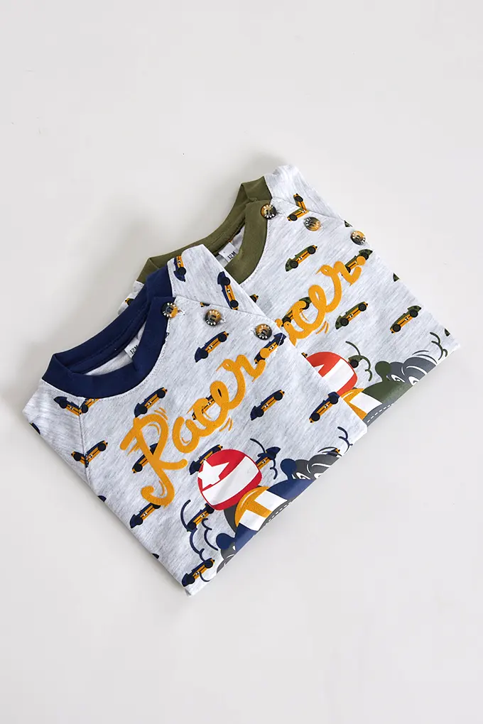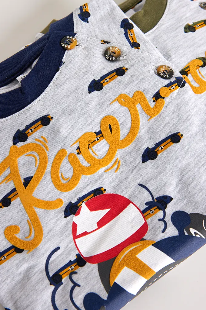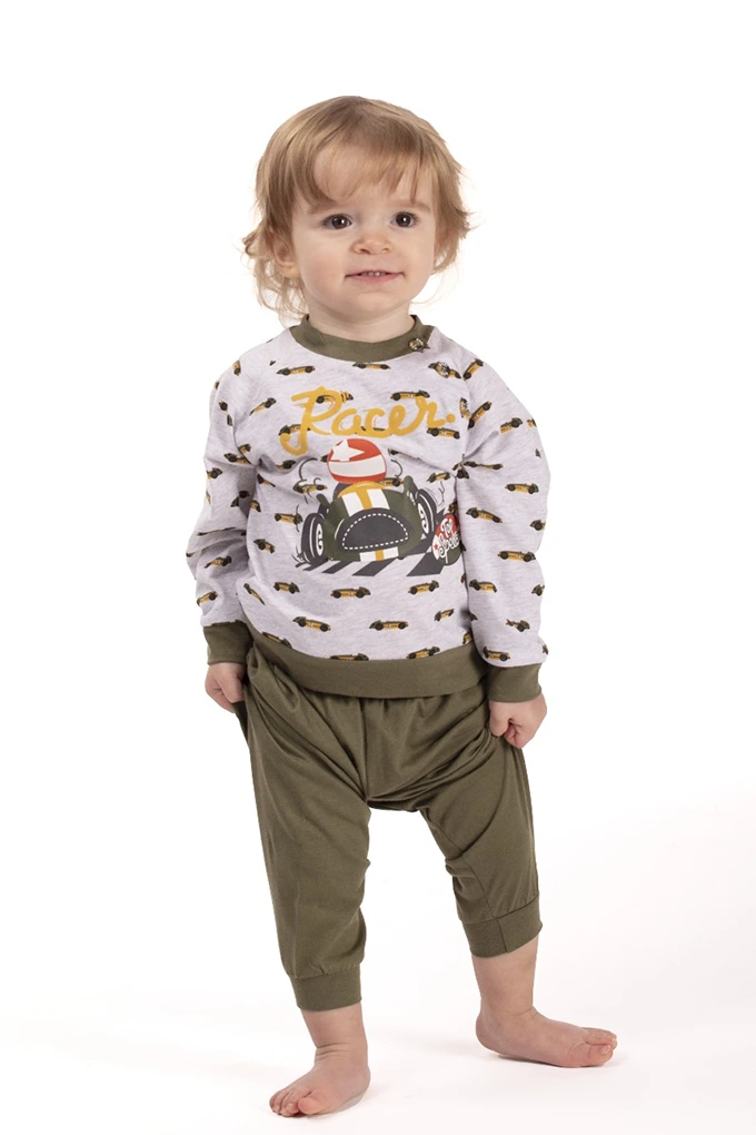 Pijama estampado sem carda, com camisola de mangas compridas e gola redonda com estampado. Calças compridas estampadas, ajustáveis na cintura com elástico, para rapaz.