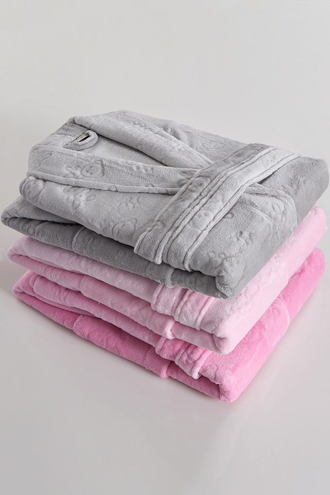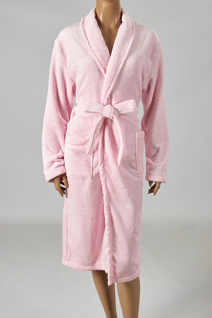 Robe em tecido de coralina com aplicações em jacquard, bolsos e cinto.
